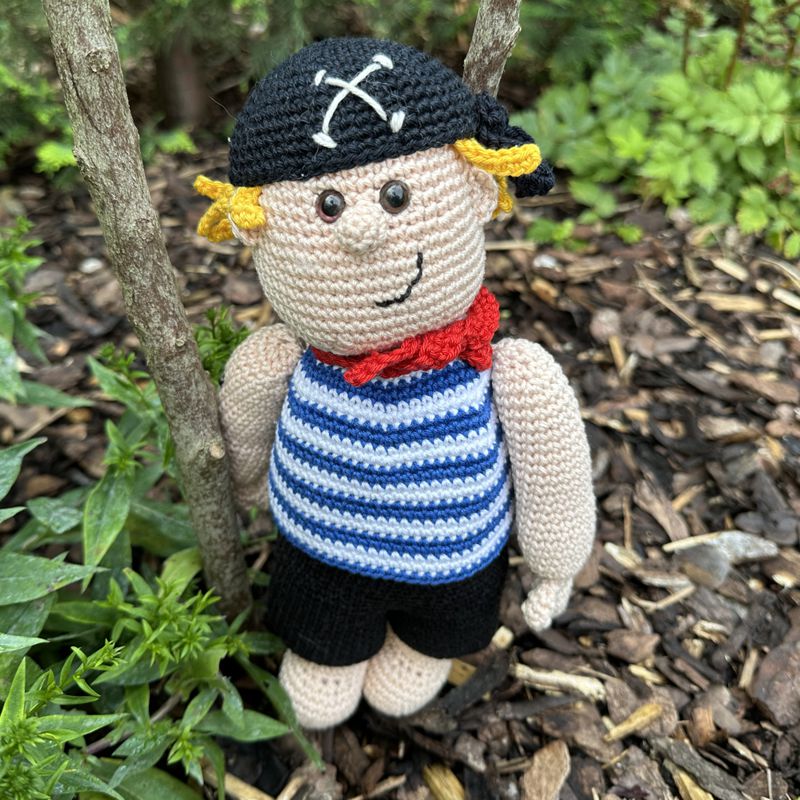 Ahoi! Mit Pietro Pirat zieht ein mutiger Schatzsucher in deine Häkelwelt ein. Der kleine Freibeuter mit Piratenhut, gestreiftem Shirt und rotem Halstuch ist bereit für neue Abenteuer.